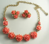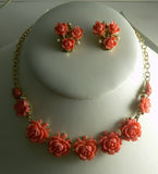 Gorgeous gold tone carved coral celluloid rose and faux pearl necklace and earring set in mint condition. The necklace is adjustable to 16" and the clip back earrings are 3/4".