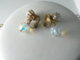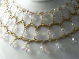 Gorgeous High End Crystal Drippy Bib Necklace and Earrings Set. AB glass crystals set in gold tone metal with matching dangle clip earrings. The necklace is amazing and measures 16 3/4" long with a hook clasp. The center design is 10 1/4" across and over 3 1/2" wide. The earrings have secure clips measuring 1 1/8" long and 3/8" wide. Even prettier in person, wonderful condition!