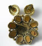 Gorgeous Red Lucite Pink Rhinestone Gold Mesh Demi Parure. The brooch measures 2 3/8" wide and almost 3/4" high. The earrings have secure clips measuring over 1 1/8" long and almost 1" wide. Very good condition. circa 1960's.