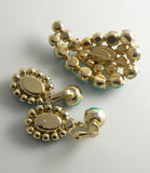 Hattie Carnegie pin & earrings turquoise blue cabochons. Vintage gold tone pin & clip earrings signed Hattie Carnegie. All pieces are prong set with Persian turquoise blue glass cabochons. The pin measures 2 1/8" x 1 1/4". The drop earrings measure 1 1/2" long and 3/4" at the widest. All pieces are in good condition.