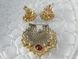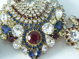 Hobe Red, white and blue rhinestone demi parure. Large brooch all rhinestones sparkly and present. Clip earrings are signed, the brooch is not. The pin on the brooch was replaced by a jeweler. The brooch measures 2 1/2" x 2 1/2" and the earrings are 1 3/4" x 1"