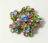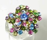 Hollycraft 1957 Multi Color Pastel 5-Point Star Brooch/Pin. This pin has a wonderful three dimensional quality. As usual, the larger rhinestones are prong set and the smaller ones are glued. Set in antiqued gold tone metal.Signed Hollycraft Copr 1957 The brooch measures 2.15" diameter. The pin mechanism is in perfect working condition and locking tight. Excellent condition.