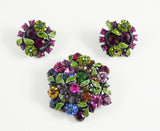 Hollycraft Black Japanned Metal Green Leaves Bright Rhinestone Brooch and Clip Earrings. This gorgeous vintage brooch and clip earrings set are japanned black metal with green enameled leaves and brightly colored rhinestones. The pin is 1 3/4" and can be worn as a pendant. All pieces are signed Hollycraft. The black metal really makes the colors pop. Excellent condition. Circa 1960.