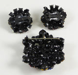 Hollycraft Black Japanned Metal Green Leaves Bright Rhinestone Brooch, Clip Earring Set, Demi Parure