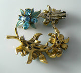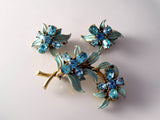This Hollycraft set features clusters of aqua rhinestone flowers amidst curving leaves with pastel aqua painted enamel on gold tone settings. The dimensional brooch measures 2 1/8" across and 1 ½" high. Matching clip-back earrings are 1" high and 7/8" across. The brooch and one earring are marked "Hollycraft, Copr 1955." The gold tone plating shows a little wear on the earring backs. Their clips remain nice and tight. Plating is intact on the brooch, and there is no wear to the set’s enamel paint. circa 1950's.