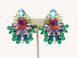 Huge Czech Rhinestone Multicolored Clip Earrings. Set in non-plated brass. These have a hot pink with purple flecks glass oval center stone. Aqua blue, opaque light mint green, lavender and emerald green glass rhinestones. Measure 2 1/4" (5.715 cm) by 1 3/4" (4.445 cm). Excellent condition.