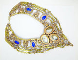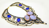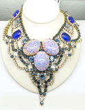Husar D Czech Glass Blue Opal Statement Necklace. Set in non-plated brass. This has round faceted Montana Blue rhinestones and round clear faceted rhinestones. Cobalt blue oval stones and light sky blue round stones. Signed Husar D. The large Opal cabochons measures 40mm by 30mm. Measures 17" in length with a 1 1/2" extension chain. Very good vintage condition.