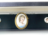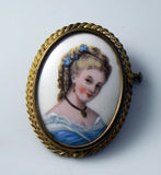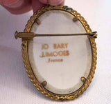 Beautiful LIMOGES Pin & Earring Set In Original Presentation Box. . .By Jo Bary. Beautiful lady on porcelain in gold one frame. The earrings are the screw back. The Pin measures 1 7/8" including frame and the Earrings are 5/8" circa 1930's - 40's. Very good condition considering age.