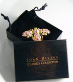 Joan Rivers Cherry Blossom Bumble Bee Brooch. Set in gold tone metal. Delicate pink and white epoxy enamel cherry blossoms adorn the body, wings and head. Faceted round green crystal eyes. Original Pouch and Box. Signed on the back of the wing. Measures 1 1/8" long by 2" wide. Excellent condition.