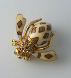Joan Rivers "Joan of the Jungle" Leopard Bee Pin from the Joan Rivers Classics Collection. Epoxy enameled and hand painted in an animal print on a gold-toned base. Green crystals for eyes and golden and yellow crystals on the body.