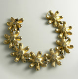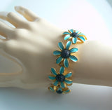 Judy Lee Enamel Daisy Flower Bracelet. Very pretty gold tone bracelet with 8 turquoise blue enamel daisy flowers and dark brown almost black textured centers.Measures approx. 7" in length by 1" wide. Very good condition.