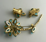 Juliana D & E Aqua Blue Rhinestone Flower Demi Parure. Set in gold tone metal. Prong set teardrop shaped open back stones and round faceted rhinestones. Measures 2 1/2" and the clip earrings are 1/4". Very good condition.