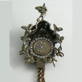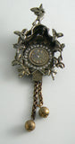 Large Figural Vintage Rhinestone Cuckoo Clock Brooch. This is a deep silver-bronze colored metal with a detailed design of a cuckoo clock. The brooch is set around the face of the clock with clear rhinestones. The small bird coming out is set on a spring. Measures 4 1/2" The longest dangle measures 1 5/8" Good vintage condition with wear and discoloration on the back. circa 1950's.