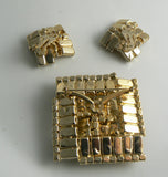 Large Square Taupe Moonstone and Yellow Rhinestone Demi Parure. This has a square pin and matching clip earrings with baguette shaped moonstones and bright yellow rhinestones. The setting is gold toned. The stones are all prong set. Measures 2" by 2" and the earrings are 1" by 1" The pin mechanism and clip earrings work great.