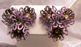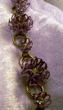 Vintage gold tone lavender flower bracelet and clip on earring set. Features painted lavender metal open filigree flowers with crystal rhinestone centers. Measures 7 " in length and 1 1/4 " in diameter.