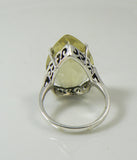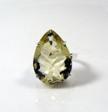 Lemon Quartz 15ct Pear Cut Gemstone Sterling Silver Filigree Ring. The golden yellow color quartz is 22mm (approx. 7/8th of an inch) by 16mm (5/8th inch) in width. This gorgeous gemstone has an amazing bright color. The inside of the band is marked 925 for sterling.
