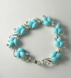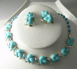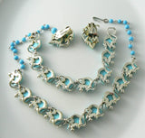 LISNER Blue Leaves Sparkling Ice Rhinestone Necklace Bracelet Earring Set. This beautiful vintage necklace, bracelet and clip earring set have blue molded plastic leaves and sparkling ice rhinestones. Necklace is 16" long and can be worn shorter with a hook style clasp. bracelet is 7" long. All pieces are signed Lisner.