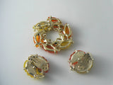 LISNER Fire Red, Orange & Yellow Molded Leaves Pin Earring Set. This beautiful vintage pin and clip earring set are gold tone with huge fire red, yellow & orange molded lucite leaves and clear rhinestones.