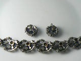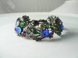 This beautiful vintage bracelet and screw back earring set are silver tone with brightly colored rhinestones. The bracelet is 7" long. All pieces are signed Lisner.