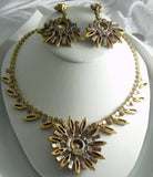 Lovely Mauve Czech Glass Rhinestone Necklace and Earring Set. Pink Mauve colored stones set in non-plated brass. Signed Husar D. Measures 19" in length, including hook and extension chain. The center piece is 2" in diameter. The clip earrings are 3" by 2" Very good condition.