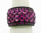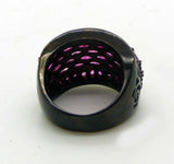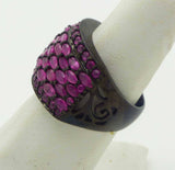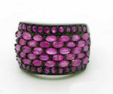 Marquise and Round cut Natural Ruby Black Rhodium over Sterling Silver Ring, Size 7. Stamped 925. This has round and marquise faceted natural pink red rubies which measure 2 by 4mm. The face of the ring measures 24 by 16mm. The total is 52.17 ct. Excellent condition.