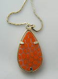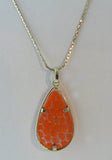Millefiori tear-shaped pendant with vibrant orange flowers strung on a perfect 19" sterling silver gold washed or Vermeer fine herringbone chain. The glass piece in the pendant that has painted orange flowers held in by 3 prongs on each side. The pendant is 1 1/4" long. The chain is 19" long & marked "Sterling."