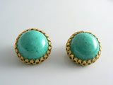 Miriam Haskell Aqua Blue Glass Cabochon Vintage Clip Earrings set in gold tone metal. Signed Miriam Haskell. These beautiful vintage clip earrings have greenish blue glass mottled cabochons. Measure almost 1" in diameter.