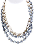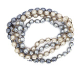 Miriam Haskell Baroque Glass Pearl Long Necklace. Signed Miriam Haskell on the hang tag. This is an extremely long necklace measuring 53" in length. There is a section of creme colored, silver colored and blackish silver glass pearls. The pearls measure approximately 10mm in diameter. Excellent, almost mint condition. circa 1950's.