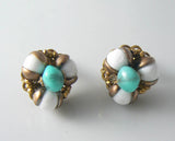 Miriam Haskell gold tone filigree and glass earrings. Turquoise and white glass stones set in gold tone filigree. Screw back and measure 1" in diameter. Signed Haskell on back. Very good condition.