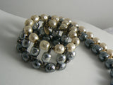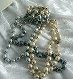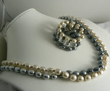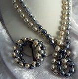 Miriam Haskell Tri-Colored Baroque Pearl Rope Necklace & Bracelet Set. The necklace is rope style at 53" long and has gleaming white, light grey and dark grey 12mm baroque pearls that are separated by 2 faceted silver spacer beads. The pearls on the memory wire wrap bracelet have the same colors and are slightly smaller in size. It measures 1" wide and is adjustable to fit most wrist sizes.The necklace is in excellent condition, the bracelet has some metal wear and slight discoloration.