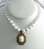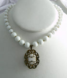 Miriam Haskell white glass pendant necklace set in gold tone metal. White glass pendant handwired to filigree backing. Signed on clasp. Necklace is 18' in length and the pendant is 1 1/2' The metal is in great condition with no verdigris.