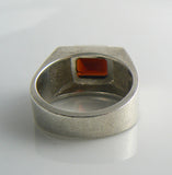Modernist Men's Sterling Silver 14k Gold Inlay Ruby Ring. Stamped Sterling with 14k gold around the genuine 3ct ruby. Size 12. The silver does have some surface scratches and a nick near the center. Solid heavy ring.