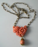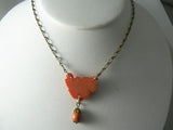 A sweet vintage gold filled necklace with a pretty molded glass floral drop. The floral glass has a large daisy and a zinnia along with foliage, a single celluloid bead hangs from the bottom.
