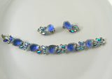 Molded Glass AB Rhinestone BSK Bracelet Clip Earring Set. This has Molded glass roses and marquis cut blue AB rhinestones. Set in silver tone metal. Signed BSK. The bracelet measures 7" in length and the clip earrings are 1 1/2". Very good condition.