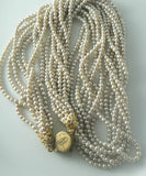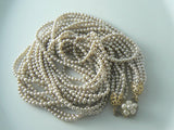 Signed Multi Strand Miriam Haskell Glass pearl Necklace. Can be worn torsade or in a graduated style. 9 Strands of tiny glass pearls. Classic Haskell flower clasp. Measures 22"