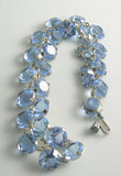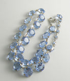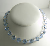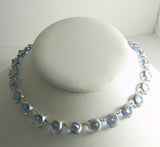 Open Back Bezel Set Sky Blue Necklace Choker. This is a gorgeous pale sky blue set in a silver meta. Each faceted glass stones measures approx 1/2" across. This necklace has a J-hook clasp. Measures 15 1/2" in total length. Excellent condition.