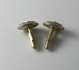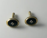 A great pair of vintage cufflinks made by Anson. Gold tone metal with a mirrored finish, set with ovals of black onyx and rhinestones in the center. Marked on the stems "Anson". The tops measure .75 inches (1.9 cm) long and .55 inches (1.4 cm) wide. In excellent condition, showing some light wear.