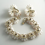 Peach and White Plastic Flower set. Peach edged flowers with red rhinestone centers. Set on a gold tone book chain with matching clip earrings. Measures 7 1/2" including fold over clasp. The earrings are 3/4" in diameter. Very good condition.
