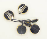 Peach Colored Cherries or Peaches Brooch. Here is a beautiful double peach Austrian Crystal Fruit Pin Brooch with matching clip earrings. Japanned metal. All pieces signed Austria. Measures 2 1/4" and the clip earrings are 3/4" in diameter. Unusual color and in very good condition with a couple fleabites on the edges of the glass fruit which are hardly noticeable.