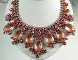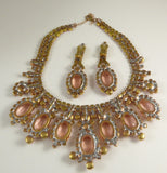 Pink Czech Glass Statement Necklace and Clip earrings. Set in gold tone metal and non-plated brass. This has large oval open back pink glass stones and smaller round faceted opaque pink ab stones. The pictures do not do it justice, this brings a new meaning to the word sparkles! The necklace measures 17" including the extension chain. The center drop is 2 3/4" The matching clip earrings are 3 1/4" Excellent condition. A stunning set.