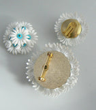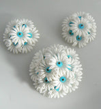 Vintage soft plastic Daisy flower pin and clip earrings set from the 1950's. The pin measures 2" in diameter and the matching clip earrings are 1 1/2". They have white petals with turquoise blue beaded centers. All three pieces are in very good condition with minimal signs of wear and no missing or broken pieces.