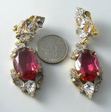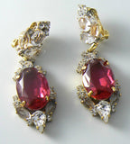 Pretty Czech glass fuchsia pink rhinestone earrings Large pink glass stone surrounded by clear glass rhinestones set in gold tone metal. Clip earrings. Measure 3" in length and 3/4" wide. Excellent condition.