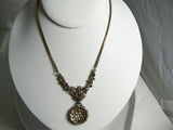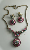 Pretty Pink and Aqua Blue Rhinestone Necklace Earring Set. This has Oval cut faceted glass stones and aqua blue round stones with tiny faux pearls. Set in gold tone metal. Possibly an unsigned Hollycraft set. Measures 15" in length and the screw type earrings are 1 1/4". The round center drop is 1" in diameter. Very good condition, no missing stones.