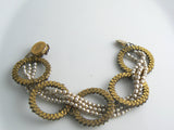 Rare Early Miriam Haskell Seed Pearl & Rose Montee Bracelet. It has 5 large gold loops that have seed pearls and rose montees wired on to their tops and 3 strands of small baroque pearls that intertwine between them. Each loop is held to the next by 2 small chains. Signed Miriam Haskell on the back of the clasp. It measures 7 1/2" long and is 1 1/4" wide. The pearls on the strands look fabulous with high luster and no peeling and all of the wiring is intact. There are however a few montees are loose.
