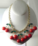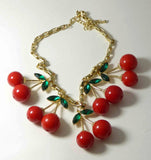 Red Cherries Bib Fringe Necklace, Lucite Cherries and Green Rhinestones. Set in gold tone metal. Fun 1980's necklace, the cherries measure 2" by 1 1/2" Measures 16" in length plus a 3" extension. Excellent condition.