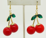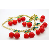 Red Cherries Bib Fringe Necklace, bracelet and pierced style earrings. This has Lucite Cherries and Green Rhinestone set in gold tone metal. Fun 1980's parure. The cherries measure 2" by 1 1/2" Measures 16" in length plus a 3" extension. The bracelet measures 7" with a 3" extension chain. The dangling post earrings are 2" Excellent condition. circa 1980's.