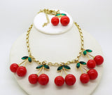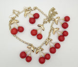 Red Cherries Parure Bib Fringe Necklace, Bracelet and Earrings, Lucite Cherries and Green Rhinestones