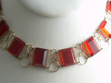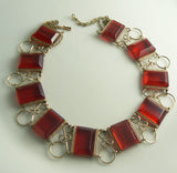 The necklace measures 15 1/2" in length. Red Lucite rectangles measure 5/8" by 1/2" or 16mm by 12mm.Very good vintage condition with some scratching to one of the rectangles. This is only visible in bright light and gives it a slightly wavy look.