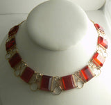 Red Lucite Open Wire Work Necklace Choker. Double gold tone chain leads to a J Hook clasp.