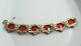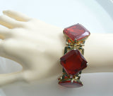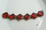 Red Square Cut Glass Art Deco Bracelet. Gold tone with large red square cut glass stones. Measures 7 1/2" in length. The O rings and safety chain are not original to the piece. Beautiful Art Deco Bracelet.